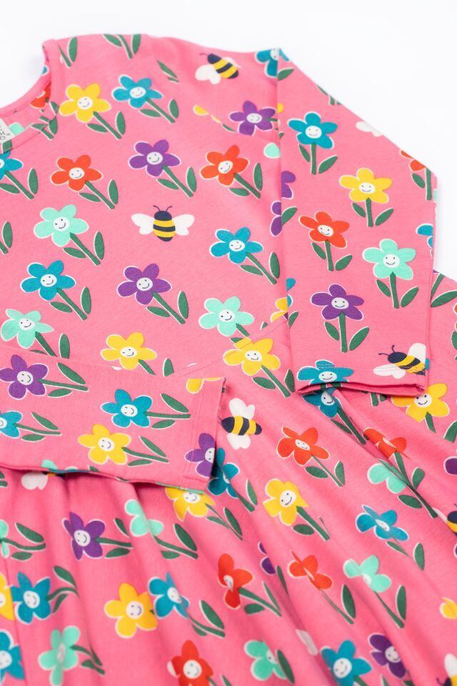 ピンクの世界で花の妖精が踊っているリズミカルなワンピース、毎日が楽しくなりそう。