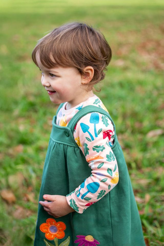 カラフルなきのこ柄のトップスと絵本の1ページから飛び出したようなチャーミングなジャンパースカートが明るく楽しい空気も作るセットアップ。