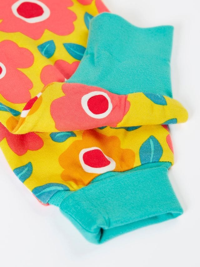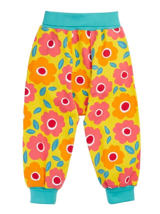 SUNイエローにピンクやオレンジのキュートなお花がどんなコーディネイトにも元気と可愛さをプラスする楽ちんパンツ。