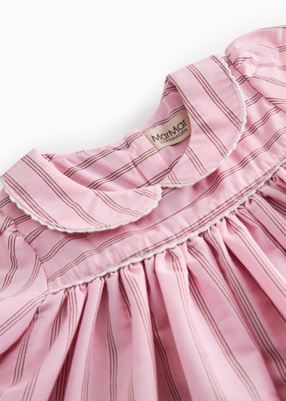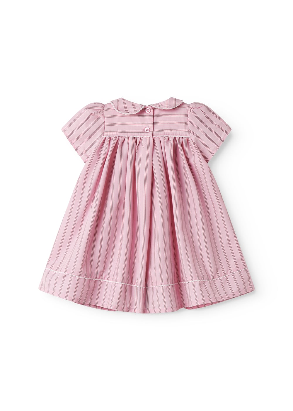 丸みを帯びたお襟とピンクストライプが可憐に映えるクラシカルなワンピース。